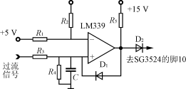 過流保護(hù)是利用SG3524的腳10加高電平封鎖脈沖輸出的功能。當(dāng)腳10為高電平時(shí),SG3524的腳11及腳14上輸出的脈寬調(diào)制脈沖就會(huì)立即消失而成為零。過流信號(hào)取自電流互感器(對SG3524-1芯片串接在工頻變壓器的副邊,對SG3524-2芯片串接在濾波電路前),經(jīng)整流后得到電流信號(hào)加至如圖6所示過流保護(hù)電路上。過流信號(hào)加至電壓比較器LM339的同相端。當(dāng)過流信號(hào)使同相端電平比反相端參考電平高時(shí),比較器將輸出高電平,則二極管D2將從原來的反向偏置狀態(tài)轉(zhuǎn)變?yōu)檎驅(qū)ǎ淹喽穗娢惶嵘秊楦唠娖?,這一變化將使得電壓比較器一直穩(wěn)定輸出高電平封鎖脈沖,則Boost電路停止工作,在正常狀態(tài)下,比較器輸出零電平,不影響B(tài)oost電路工作。