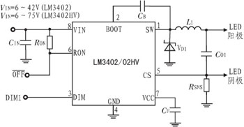 高亮度白光二極管一般采用恒流電源驅(qū)動(dòng)。因?yàn)殡S著LED逐漸變熱,其電壓降將減小,而且若LED串由恒壓電源供電的話,電源往往會(huì)持續(xù)提供過(guò)多的電流,使輸出電壓增大,直到電源達(dá)到電流限值或LED失效。脈寬調(diào)制方式是用較高的頻率開(kāi)關(guān)LED,開(kāi)關(guān)頻率超出人一般能夠察覺(jué)的范圍,給人一種LED總亮的假象,現(xiàn)在普遍采用脈寬調(diào)制方式調(diào)節(jié)LED的亮度,在某些應(yīng)用中,調(diào)光比可達(dá)5 000:1,常用的LED驅(qū)動(dòng)有降壓型(Buck)、升壓型(Boost)、升降壓型(Buck~Boost)等3種。LM3402是一款由可控電流源衍生的降壓型穩(wěn)壓器,輸入電壓范圍涵蓋整個(gè)汽車應(yīng)用領(lǐng)域,內(nèi)置MOS管最多可以驅(qū)動(dòng)5顆LED,性價(jià)比高,且接受領(lǐng)域較廣、線路簡(jiǎn)潔實(shí)用,是眾多LED驅(qū)動(dòng)IC中間的佼佼者。