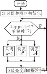 控制器程序根據(jù)3個(gè)按鈕的輸入狀態(tài),實(shí)現(xiàn)開(kāi)關(guān)或亮度調(diào)節(jié),并將亮度狀態(tài)在4個(gè)指示燈上顯示出來(lái)。利用微處理器自身集成的EEPROM單元,可隨時(shí)保存亮度狀態(tài)n(PWM占空比)。主程序流程框圖如圖3所示。