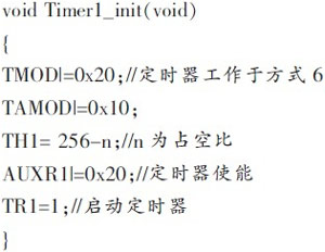 微處理器P89LPC932內(nèi)部定時(shí)器TO/T1的PWM輸出與計(jì)數(shù)輸入和定時(shí)器觸發(fā)輸出占用相同的管腳,發(fā)生定時(shí)器溢出時(shí)自動(dòng)觸發(fā)端口輸出。此功能通過(guò)AUXR1寄存器中的控制位ENT0和ENT1分別使能定時(shí)器0和1。該模式打開(kāi)時(shí),在首次定時(shí)器溢出前端口的輸出為邏輯1。為了使該模式生效,必須清零C/T位以選擇PCLK作為定時(shí)器的時(shí)鐘源。定時(shí)器初始化設(shè)置參考程序如下: