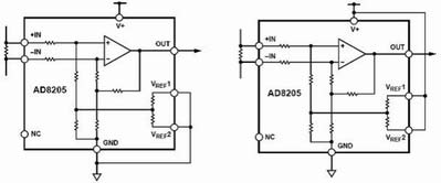 雙極性輸出時AD8205可以測量流過采樣電阻上的雙向電流,這時,輸出可以偏置到輸出范圍內(nèi)的任意位置。當(dāng)被檢測的正反兩個方向上的電流為等幅時,其輸出必須偏置到滿量程輸出的中間位置。當(dāng)雙向電流幅值不對稱時,輸出偏置可以對應(yīng)地偏離半量程位置。它的兩個參考輸入VREF1和VREF2分別連接一個內(nèi)部電阻RREF后接到同一個內(nèi)部偏置節(jié)點(diǎn),這兩個參考輸入端的操作方式完全相同。在兩個參考電壓輸入端接入對應(yīng)的電壓,即可完成對輸出的偏置。在雙極性輸出方式下,一般有以下兩種連接方式。