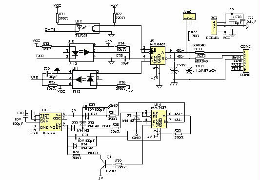 ②下半部分用于無源RS232→RS485的轉(zhuǎn)換電路,保證兩端同時可用,但在系統(tǒng)中只