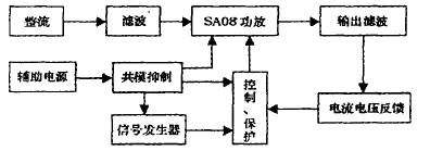 由于將振蕩電路、控制電路、驅(qū)動電路和功率器件全部集成于模塊內(nèi)部;SA08的可靠性大為提高;且接口非常簡潔。樣機電源以SA08為核心;由整流電路、輔助電源、中頻信號發(fā)生器、反饋控制電路和輸入輸出濾波電路等部分構(gòu)成。原理圖見圖3。