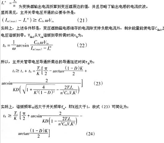 從上面的分析可明顯地看出,當(dāng)變壓器勵(lì)磁電感l(wèi)m減小,勵(lì)磁電流足夠大時(shí),[t5~t0′]期間勵(lì)磁電流除了能提供負(fù)載電流外,剩余部分可用來(lái)幫助電容cds2、cds1充放電。電壓vds1有可能諧振到零,從而實(shí)現(xiàn)主功率開(kāi)關(guān)管s的零電壓軟開(kāi)通。二極管d1可為負(fù)的勵(lì)磁電流續(xù)流。關(guān)鍵工作波形如圖2(b)所示,具體的軟開(kāi)關(guān)條件將在下一節(jié)中詳細(xì)討論。很顯然,軟開(kāi)關(guān)的代價(jià)是變壓器勵(lì)磁電流和開(kāi)關(guān)管導(dǎo)通電流峰值大幅增加,開(kāi)關(guān)管及變壓器電流應(yīng)力和通態(tài)損耗明顯加大。