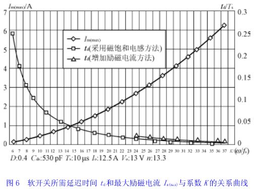 死區(qū)延遲時(shí)間,意味著pwm變換器有效占空比的損失。為了盡量減小有效占空比的損失,則k必須加大。另一方面,變換器開(kāi)關(guān)頻率fs愈高,則為保持相同的有效占空比,k至少應(yīng)保持不變,即諧振頻率ω應(yīng)與開(kāi)關(guān)頻率fs成比例增加。圖6給出了軟開(kāi)關(guān)所需要的死區(qū)時(shí)間td和最大勵(lì)磁電流im(max)與k的關(guān)系曲線(xiàn)。從圖中明顯看出,采用加大勵(lì)磁電流的方法實(shí)現(xiàn)零電壓軟開(kāi)關(guān)和采用磁飽和電感器比較,要求的k較大,因而有較大的勵(lì)磁電流損耗;另外,從式(15)看出,開(kāi)關(guān)頻率愈高,電流峰值也愈高,變壓器的銅耗和開(kāi)關(guān)管的導(dǎo)通損耗也愈大。因此,軟開(kāi)關(guān)有源鉗位正激變換器工作頻率不宜太高。