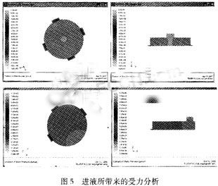 檢測(cè)過(guò)程中應(yīng)考慮液體輸入微反應(yīng)室時(shí)對(duì)工作電極表面敏感膜及室壁產(chǎn)生的力的作用,因?yàn)榱Φ淖饔貌划?dāng)會(huì)產(chǎn)生敏感膜脫落的現(xiàn)象。實(shí)驗(yàn)過(guò)程中通過(guò)合理地設(shè)計(jì)選擇進(jìn)液口位置來(lái)優(yōu)化力的分布,減少對(duì)敏感膜表面產(chǎn)生的沖擊。在設(shè)計(jì)的4種結(jié)構(gòu)中,對(duì)進(jìn)液口位置的選擇分成中心處和邊緣處兩種,兩種結(jié)構(gòu)的壓力分布圖對(duì)比如圖5所示。在進(jìn)液管道附近,液體產(chǎn)生較大的力的作用,而將進(jìn)液口從反應(yīng)區(qū)域正上方移至邊緣處,其產(chǎn)生的力會(huì)在中心敏感區(qū)域外圍被電極周邊區(qū)域和富有彈性的PDMS室壁緩沖而減弱,不會(huì)影響到敏感膜生成區(qū)域,較好地解決了進(jìn)出液對(duì)敏感膜可能造成的損害問(wèn)題;而在中心開(kāi)口的兩種結(jié)構(gòu)位于敏感反應(yīng)區(qū)上方,如圖可見(jiàn)試劑輸人時(shí)會(huì)有力作用于中心處,特別是當(dāng)液體輸入速度較高時(shí),會(huì)對(duì)敏感膜造成損傷。