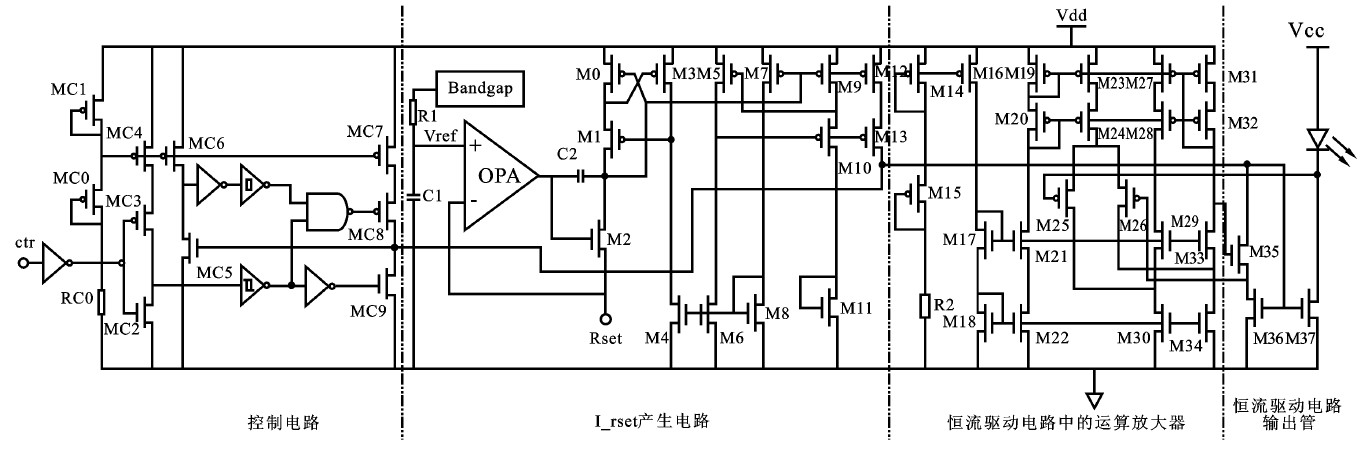 恒流驅(qū)動模塊是整個控制電路設(shè)計核心,決定整體電路的恒流特性。針對此模塊給出三種方案。具體電路結(jié)構(gòu)如圖1所示。圖中電流I_rset只受控于外接電阻Rset,當(dāng)Rset不變時,此電流恒定。Vcc是電路的外接電壓,用來為LED供電。