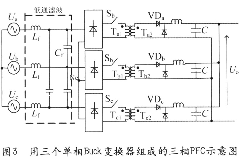 圖3用三個(gè)單相Buck變換器組成的三相PFC示意圖,圖3所示Buck型電路的結(jié)構(gòu)比較簡(jiǎn)單,同全橋電路相似,由于隔離變壓器反射電壓的影響,其相對(duì)于反激電路來說也有較大的電流失真,但其諧波仍可以限定在比較低水平,達(dá)到IEC—1000的要求。另外,其可實(shí)現(xiàn)的功率等級(jí)的大小不如全橋高,但比反激式電路要大。