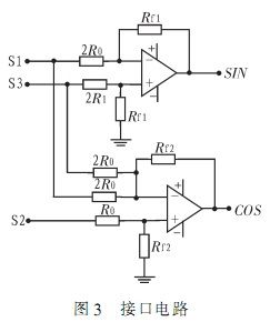 由于RD-19230芯片內(nèi)部處理信號為兩路正交信號,通常情況下可由旋轉(zhuǎn)變壓器直接提供,其正常工作情況下對兩路輸入信號電壓要求為2Vrms±15%,而自整角機(jī)輸出信號為三線壓值不定的信號,從而設(shè)計出簡單方便的轉(zhuǎn)換電路是有必要的。