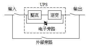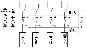 本系統(tǒng)設(shè)計(jì)利用美國山特公司3C3 UPS的特性,該UPS有一個(gè)內(nèi)部電子旁路檢修開關(guān),UPS在關(guān)機(jī)狀態(tài)下,電源是通過UPS內(nèi)部電子旁路直接輸出供電。外部再加一個(gè)旁路開關(guān)(圖1),外部旁路開關(guān)與內(nèi)部電子旁路開關(guān)形成并聯(lián)。UPS加入供電系統(tǒng)時(shí), UPS必須在關(guān)機(jī)狀態(tài)下,接通UPS輸入輸出端開關(guān),UPS與外部旁路開關(guān)形成并聯(lián)接通,然后斷開外部旁路開關(guān),再將UPS開機(jī)。UPS退出供電系統(tǒng)時(shí),必須先將UPS關(guān)機(jī),接通外部旁路開關(guān)(若UPS未在關(guān)機(jī)狀態(tài)下,相當(dāng)于UPS在開機(jī)時(shí)輸出端加入反向電壓,UPS可能燒毀),斷開UPS輸入輸出端開關(guān), UPS退出供電系統(tǒng)。這樣就很容易做到將UPS加入和退出供電系統(tǒng)中。