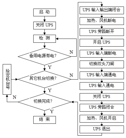 本系統(tǒng)主要是利用現(xiàn)有發(fā)電機(jī)組在不停機(jī)的情況下進(jìn)行雙電源切換。原來電源切換是在主供電回路上通過一個(gè)雙頭刀閘切換,現(xiàn)在將用電系統(tǒng)分割成四個(gè)單元,在每個(gè)分路上各安裝一個(gè)雙頭刀閘,分別對(duì)假捻機(jī)進(jìn)行逐臺(tái)切換。雙頭刀閘切換是人工操作,刀閘在轉(zhuǎn)換過程中會(huì)出現(xiàn)瞬間斷電現(xiàn)象,這樣就會(huì)造成假捻機(jī)停機(jī),這是電源切換不能連續(xù)生產(chǎn)的原因,解決這個(gè)問題是本方案設(shè)計(jì)關(guān)鍵。所以,在電源切換前先將要切換電源假捻機(jī)的電加熱和風(fēng)機(jī)停下來降低負(fù)荷,然后將不間斷電源UPS串聯(lián)在要切換的電路中,雙頭刀閘轉(zhuǎn)換時(shí)用UPS的電池組為假捻機(jī)提供傳動(dòng)系統(tǒng)的電源,就不會(huì)出現(xiàn)斷電現(xiàn)象,可以對(duì)該假捻機(jī)進(jìn)行電源切換。切換完成后將UPS退出供電系統(tǒng),再將電加熱和風(fēng)機(jī)開啟,這樣就完成了一臺(tái)假捻機(jī)的切換。再進(jìn)行下一臺(tái)的切換,以此循環(huán)便可完成全部假捻機(jī)的切換(圖2)。