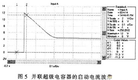 超級電容器與蓄電池并聯(lián)時(shí),汽車啟動過程的電壓波形如圖4所示,電流波形如圖5所示。與圖1和圖2相比,啟動瞬間電壓跌落由只采用蓄電池時(shí)的3.2V提升到7.2V;啟動電流從560A提高到l200A;啟動瞬時(shí)的電源輸出功率從2kW上升到8.7kW;啟動過程的平穩(wěn)電壓由7V提高到9.4V;啟動過程的平穩(wěn)電流由280A提高到440A;啟動過程的電源平穩(wěn)輸出功率從2.44kW提高到4.12kW。