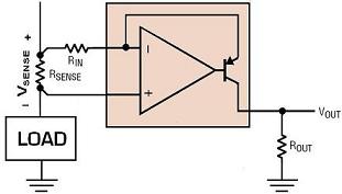 為了克服這些電流檢測(cè)難題,人們創(chuàng)造了高端電流檢測(cè)放大器。這些特殊放大器用來(lái)從高共模電壓中抽取通過小檢測(cè)電阻的電流產(chǎn)生的小差分電壓。然后,檢測(cè)電壓被放大并被轉(zhuǎn)換成以地為基準(zhǔn)的信號(hào)。圖 5 顯示了高端電流檢測(cè)放大器的基本拓?fù)?。在這個(gè)圖中,放大器給 RIN 加上等于 VSENSE 的電壓。然后,通過 RIN 的電流流過 ROUT,提供以地為基準(zhǔn)的輸出電壓。就這個(gè)基本功能而言,很明顯,高端電流檢測(cè)放大器應(yīng)該有高輸入阻抗、高增益和高增益準(zhǔn)確度、以及寬共模范圍和良好的共模抑制。也許不那么明顯的是還有放大器精確度的重要性。