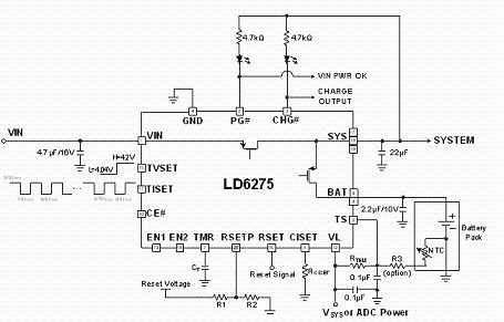為滿足低耗電可攜式產(chǎn)品對于更精確、更安全的充電器應用需求,許多IC制造商發(fā)展出低成本線性充電器。圖2是以通嘉科技的LD6275充電IC為設計范例,構成僅需少數(shù)外部零件的獨立式線性充電器電路,其具備1.5A的最大充電電流。