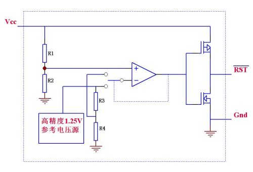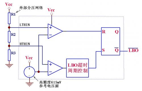IC內(nèi)含一個高精度的615mV基準電壓源、兩個比較器、一個RS觸發(fā)器和其它一些邏輯電路,其大致功能是:VCC電壓或其它待檢測電壓通過R1-R3組成的分壓網(wǎng)絡(luò)接在IC的LTHIN /HTHIN檢測引腳,當(dāng)待測電壓下降導(dǎo)致LTHIN引腳低于615mV時,輸出腳LBO輸出低電平,而如果待測電壓上升導(dǎo)致HTHIN引腳高于615 mV時,經(jīng)過內(nèi)部邏輯判斷和簡單延時后,輸出腳LBO輸出高電平。