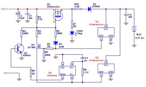 至此大家想必也大致了解了圖三的工作流程了:接上電池和充電器,如果電池電壓低于2.8V,則U1輸出為低(U2輸出也是低),這樣R3和R4的回路都不通,只有R2回路導(dǎo)通,給Q1提供微弱的導(dǎo)通,使之輸出約數(shù)毫安的電流給電池進行預(yù)充電,當(dāng)電池電壓上升到超過2.94V(1.05X2.8)時或者剛接上電池電壓就超過2.94V時,U1輸出高電平而U2繼續(xù)輸出低電平(電池電壓還沒達到4.2V J),這時R2通路截止而R3通路導(dǎo)通(因為Q4導(dǎo)通且其源極電平為低-因U1輸出拉低),從而由較小阻值的R3令Q1完全導(dǎo)通,提供一個數(shù)百毫安的大電流恒流充電,而當(dāng)這個恒流充電過程慢慢令到被充電的Li+電池端電壓上升到4.2V時,U2也輸出高電平從而關(guān)閉Q4,但是它同時也給U3提供了電源導(dǎo)致U3開始工作,這樣U3觸發(fā)Q3使R4導(dǎo)通提供一個很小的補充充電電流,直至U3達到定時時間從而關(guān)閉Q3,這時整個充電過程才完全結(jié)束。
