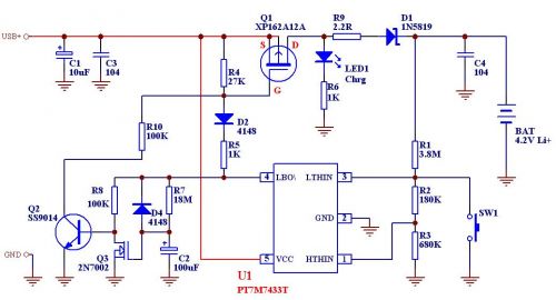 PT7M7433T是上海百利通公司最新設(shè)計的極高精度的一系列電壓檢測器的其中一款,其檢測精度在0-Vcc (5.5V)范圍內(nèi)小于1mV,而且其批量IC的檢測值偏差<±2.5%,這樣完全保證了批量產(chǎn)品的性能一致性和極高的總體性能,我們利用其配合少量外部電路即可組成相當(dāng)簡單的鋰電池充電線路。