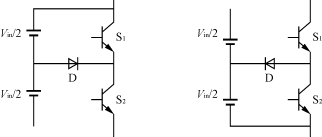 文獻[2]分析了三電平DC/DC變換器的推導過程:用兩只開關管串聯(lián)代替一只開關管以降低電壓應力,并引入一只箝位二極管和箝位電壓源(它被均分為兩個相等的電壓源)確保兩只開關管電壓應力均衡。電路中開關管的位置不同,其箝位電壓源與箝位二極管的接法也不同。文中提取出兩個三電平開關單元如下圖1所示。圖1(a)中,箝位二極管的陽極與箝位電壓源的中點相連,稱之為陽極單元;圖1(b)中,箝位二極管的陰極與箝位電壓源的中點相連,稱之為陰極單元。