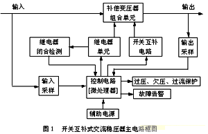 本穩(wěn)壓器由補(bǔ)償變壓器組合單元、繼電器單元、開關(guān)互補(bǔ)電路、控制電路、過欠壓以及過流保護(hù)及故障告警電路、輔助電源等部分組成,整機(jī)框圖如下: