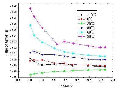 (2) 電壓檢測電路的誤差。電壓檢測電路中的誤差主要來自于電阻對的偏差以及三極管的偏差。對電壓檢測電路在不同溫度下的放大倍數(shù)進行了實驗,結(jié)果如圖4所示。