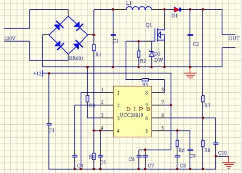 芯片選擇:TI公司的UCC28019可控制功率輸出為100W-2KW,功率因數(shù)可提高到0.95,符合設(shè)計(jì)要求,故此次設(shè)計(jì)選用該款芯片;