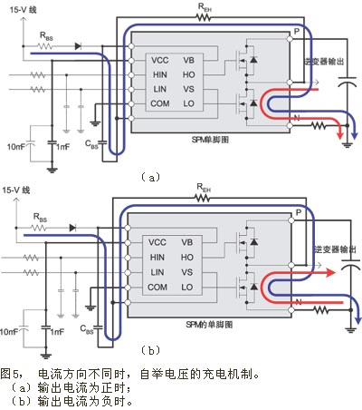 MOSFET逆變器的另一個優(yōu)點是圖4(e)所示的自舉電壓(陰極輸出電壓)。從圖4(e)可以看出,電機的工作頻率為10Hz。圖中畫出了自舉電壓和逆變器輸出電流。當(dāng)電流為正時,自舉電壓VBS維持在VCC=15V附近,但當(dāng)電流為負時,VBS就下降到接近10V。這是由于不同電流方向采用不同的充電機制所造成 (參見圖5)。當(dāng)輸出電流為正時,電流要么流經(jīng)高壓側(cè)MOSFET,要么流經(jīng)低壓側(cè)體二極管。在這種情況下,當(dāng)?shù)蛪簜?cè)體二極管導(dǎo)通時,將對自舉電容CBS充電 (參見圖5(a))。此時,對CBS的充電電壓可由公式(2)表示。