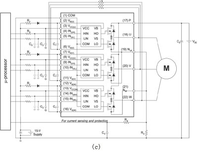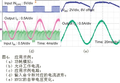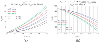 圖4給出了本模塊的一個應(yīng)用示例。在圖4(a)和(b) 的模擬中,假設(shè)結(jié)區(qū)溫度Tj保持為125℃;該溫度為本模塊的最大工作結(jié)區(qū)溫度。通過這項模擬,肯定當(dāng)模塊外殼溫度控制在100℃并采用空間向量調(diào)制 (SVPWM) 時,輸出功率可大于Pout=100W,并允許Pd=16W的功率損耗。根據(jù)這些信息,我們利用一臺130W BLDC電機(正弦反電動勢) 和圖4(c)所示的電路,對模塊的額定功率進行驗證實驗。實驗中采用的散熱片有效表面積約為100cm2。采用該散熱片后,模塊在20kHz SVPWM下可向電機輸出150W的功率;熱功耗為12W。而此時模塊的外殼溫度為86℃,MOSFET結(jié)區(qū)溫度為104℃,環(huán)境溫度27℃。在同樣條件下采用圖4(d)所示的非連續(xù)PWM時,由于有效開關(guān)頻率降低,模塊的功耗可達到8W,而逆變器效率可達到95%。此時,模塊的外殼溫度為62℃,結(jié)區(qū)溫度為82℃(已考慮電機鐵芯的損耗),逆變器的損耗為整個系統(tǒng)功耗的27%
