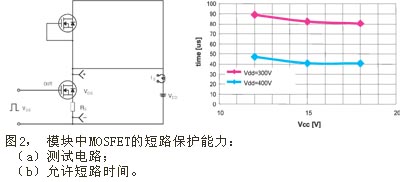 MOSFET的另一個優(yōu)勢是其耐用強度。它比IGBT的耐用強度高;與額定功率相同的其它器件相比,具有更寬的安全運行區(qū) (SOA)。本文所介紹逆變模塊中的MOSFET在典型的運行條件 (Vcc=15V, Vdc="300V", Tc="25"℃) 下,都能承受80ms的短路電流 (見圖2)。而且,在出現(xiàn)電涌時,基于MOSFET逆變器的抵御能力優(yōu)于額定電壓相同的IGBT方案,這已被開關(guān)器件的雪崩額定電壓值所證實。因此,在220V下可采用額定電壓為500V的MOSFET,而在相同條件下采用IGBT,其額定電壓則需要達到600V。但是,傳統(tǒng)的MOSFET開關(guān)速度極高。MOSFET通常用于快速開關(guān)轉(zhuǎn)換器,如AC/DC或DC/DC電源,這些應(yīng)用場合要求柵極電荷Qg盡可能少,以降低開關(guān)損耗。不過,在電機驅(qū)動應(yīng)用中,這種快速特性沒有用處,尤其是高的dV/dt值還會引起電磁干擾。穩(wěn)定性與最佳性能不易兼顧.