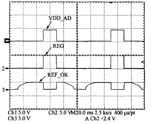 VDD-AD是檢測(cè)模塊的供電電壓,設(shè)計(jì)驅(qū)動(dòng)能力為2 mA.芯片負(fù)載減小時(shí),關(guān)斷REG,減小了芯片的靜態(tài)功耗,這樣既能保證芯片的驅(qū)動(dòng)能力,又同時(shí)降低了芯片的靜態(tài)功耗。