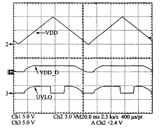 UVLO的啟動(dòng)電流測(cè)量值僅為17.8 A,實(shí)現(xiàn)了系統(tǒng)的低啟動(dòng)電流。系統(tǒng)上電和掉電的測(cè)試結(jié)果如圖11和圖12所示??梢?jiàn)系統(tǒng)在VDD的設(shè)置門(mén)限內(nèi)工作良好,REF-OK可以正確指示各個(gè)供電模塊正常工作。掉電過(guò)程正好相反。