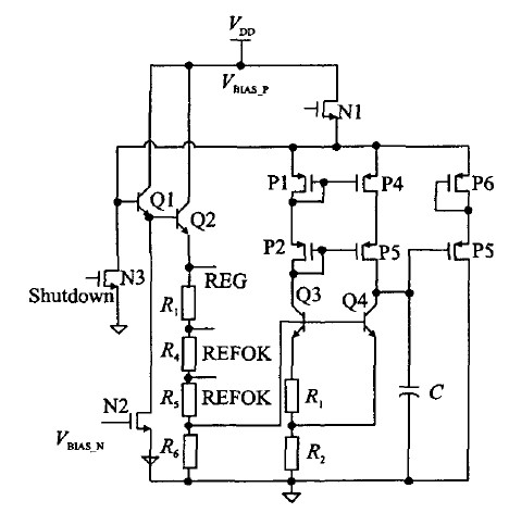 穩(wěn)壓機(jī)理如下:當(dāng)負(fù)載增加時(shí),REG電壓下降,則Q4基極下降,集電極升高,經(jīng)過(guò)P5、P6,使得Q1、Q2基極升高,REG 電壓升高;反之亦然。