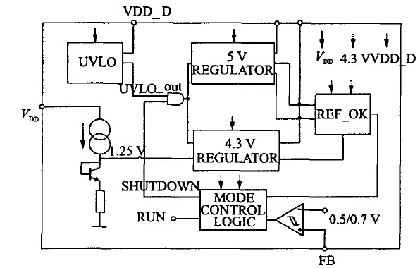 4.3 V 的穩(wěn)定電壓源(VDD-AD)用來(lái)在輕載時(shí)為系統(tǒng)供電,始終保持工作,在BURST模式下由它為模擬模塊供電。