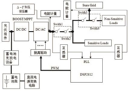 正常工作時,開關(guān)Switch1、Switch2、Switch3、Switch4同時閉合,為當(dāng)?shù)刎?fù)荷提供電能;當(dāng)出現(xiàn)電網(wǎng)缺相、電壓嚴(yán)重跌落等非正常狀況時,由DSP檢測出異常情況,做出判斷決策,并控制開關(guān)的開通與0關(guān)斷。這時,開通Switch1和Switch2,關(guān)斷Switch3,保證重要負(fù)荷的供電。當(dāng)逆變器發(fā)生故障時,立即斷開Switch1,逆變器退出,同時斷開Switch4,由電網(wǎng)對重要負(fù)荷供電。當(dāng)逆變器故障消失時,在與電網(wǎng)同步后,開通Switch1,再閉合Switch4,恢復(fù)對當(dāng)?shù)刎?fù)荷的供電。當(dāng)需要檢修逆變器時,先斷開開關(guān)Switch2,檢修完成后,重新閉合Switch2。