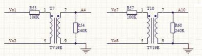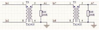 此系統(tǒng)輸出電流小于1A,故選擇最大可以測量1A的電壓型電流互感器TA1410,負(fù)載電阻用是200歐,輸出電壓為-1V~1V的交流電壓。電路如圖4所示。