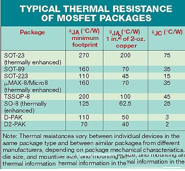 例如,采用1平方英寸的銅片,D-Pak的ΘJAD-Pak可能是50°C/W。但如果銅片就設(shè)在封裝引腳下,ΘJA值將會(huì)加倍(參見表)。采用多個(gè)并聯(lián)MOSFET,ΘJA主要依賴于它所安裝的銅片面積。兩個(gè)元器件的等效ΘJA可能是只有一個(gè)元器件時(shí)的一半,除非銅片的面積加倍。就是說(shuō),增加并聯(lián)MOSFET而不同時(shí)增加銅片面積,將使RDS(ON)減半,但對(duì)ΘJA的改變小得多。