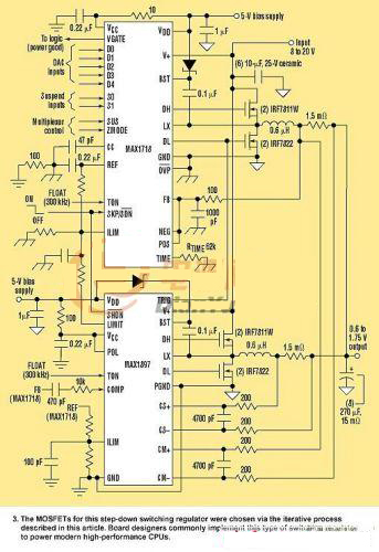圖3所示CPU內(nèi)核電源在40A提供1.3V。兩個(gè)同樣的20A電源在300kHz運(yùn)行,提供40A輸出電源。MAX1718主控制器驅(qū)動(dòng)一個(gè),而MAX1897從控制器驅(qū)動(dòng)另一個(gè)。該電源輸入范圍在8~20V之間,指定封裝的最高工組作環(huán)境溫度60°C。