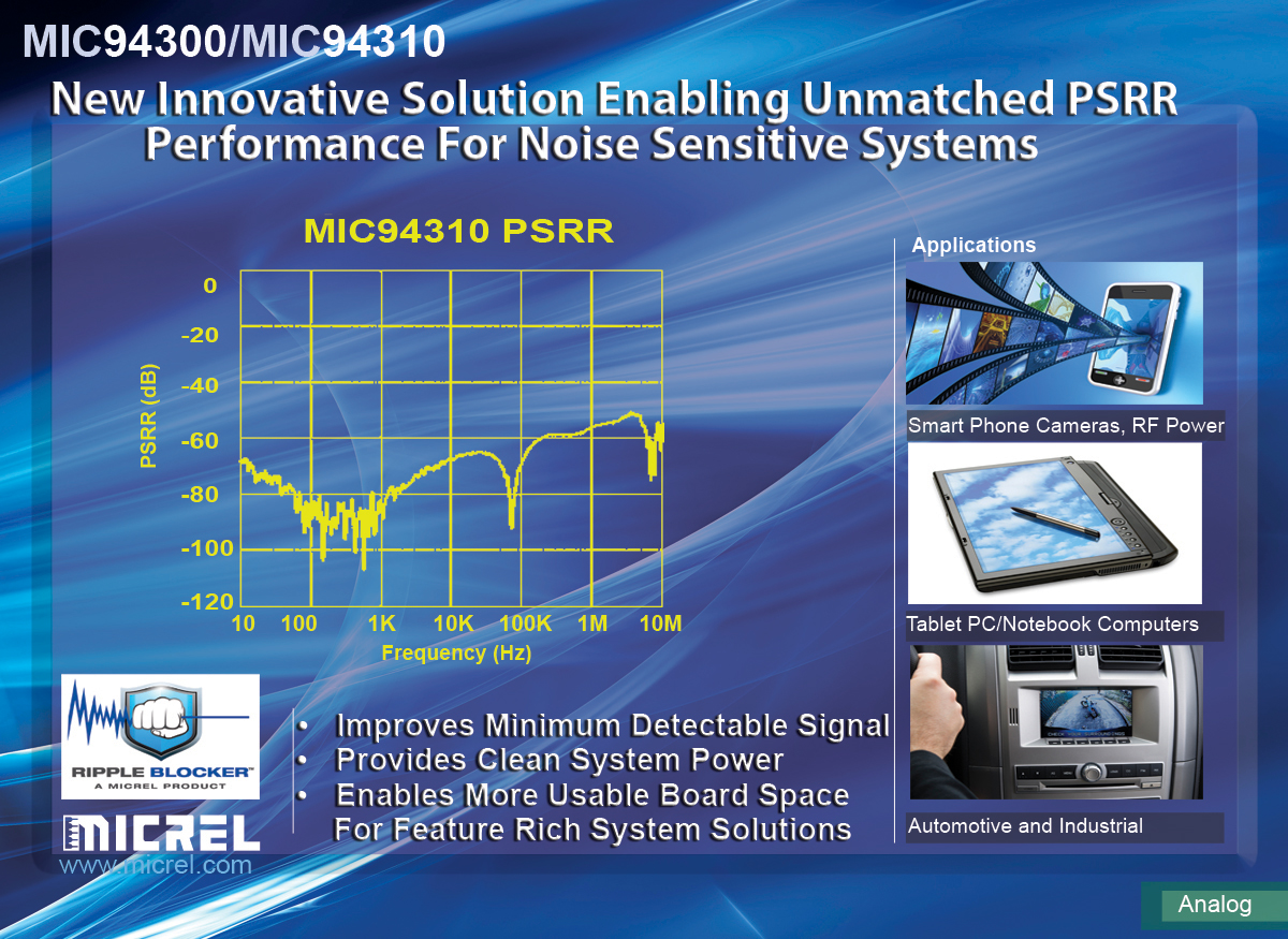 模擬、高帶寬通信及以太網(wǎng)集成電路(IC)解決方案領(lǐng)域的行業(yè)領(lǐng)導者麥瑞半導體(Micrel Inc.)近日發(fā)布了Ripple Blocker系列IC,包括MIC94300電壓跟隨輸出IC和MIC94310固定輸出(LDO)IC。