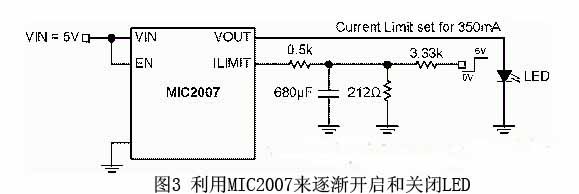 MIC2007可以在開關(guān)開啟且LED已點亮之后調(diào)節(jié)限流值。而通過改變限流值,就可以動態(tài)調(diào)節(jié)LED的光強度。如圖5所示,有4個電阻器連接到Ilimit管腳。