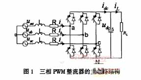 圖1是三相PWM整流器的拓樸結(jié)構(gòu),功率開關(guān)按采用的調(diào)制方式動作,由于輸入電感的濾波作用,整流器交流側(cè)可近似認(rèn)為是三相正弦電流;直流側(cè)有大電容穩(wěn) 壓,輸出呈直流電壓源特性,穩(wěn)態(tài)時輸出直流母線電壓可保持不變,一般情況下,要求控制輸入電流與輸入電壓同相位,通常采用電壓外環(huán)和電流內(nèi)環(huán)的雙環(huán)控制方 式,電壓外環(huán)主要是保證直流輸出電壓穩(wěn)定,電流內(nèi)環(huán)主要是按電壓外環(huán)輸出的電流指令進(jìn)行電流控制,如實(shí)現(xiàn)單位功率因素正弦波電流控制。