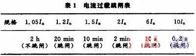 在漏電防火控制系統(tǒng)中,電流過載跳閘時間表見表1。