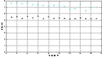 對(duì)12V100Ah開口蓄電池,分別采用HIOKI3550內(nèi)阻測(cè)試儀(工作頻率1000Hz,測(cè)量電流為幾十mA)和BM6500(工作頻率10Hz,測(cè)量電流1A)測(cè)量17只電池的內(nèi)阻,其結(jié)果如圖2-8所示,圖中“☆”為BM6500測(cè)得的數(shù)值,“+”是HIOKI3550所測(cè)得數(shù)值。可見BM6500所測(cè)數(shù)據(jù)均比HIOKI3550的數(shù)值高。但從圖2-8還發(fā)現(xiàn),兩種方法測(cè)量的數(shù)據(jù)差值并不是一個(gè)恒值或者固定比例。