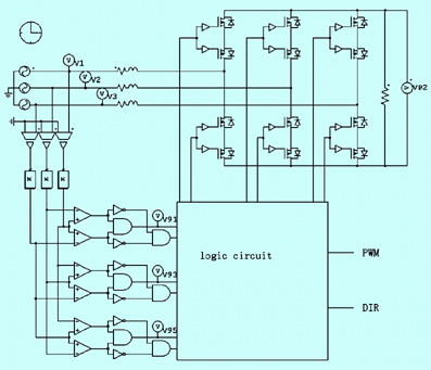 虛擬整流技術(shù)的實(shí)現(xiàn),主要通過三相同步檢測(cè)電路取得同步控制信號(hào),然后控制功率器件來模擬二極管橋式整流電路對(duì)三相交流電進(jìn)行整流,同時(shí)防止輸入的三相交流電相間短路。其原理如圖9所示,是一個(gè)輸出方向固定的虛擬整流電路。仿真波形如圖5所示,它們分別是矩陣變換單元的三相輸入電壓、6路同步信號(hào)和虛擬整流后得到的輸出電壓波形。