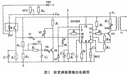 當負載過流時,經(jīng)脈沖變壓器次級耦合,其初級也過流,流過R24的壓降增大,光耦PHT導通,SG1524的10腳電壓被抬高,SG1524關閉,無輸出電壓,從而保護電源。
