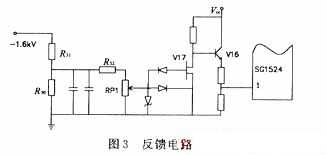 高壓經(jīng)R30,R31分壓濾波送至場效應管V17,經(jīng)V17電壓放大后,再經(jīng)射隨器輸出,送至SG1524的1端。假設電源電壓降低或負載電阻變小引起輸出電壓降低時,則反饋到SG1524內(nèi)的誤差放大器反相輸入端1的電壓將減小,誤差放大器輸出電壓將增加,從而使加到脈寬調(diào)制比較器反相輸入端電壓增大,輸出晶體管的導通時間變大,故功率晶體管導通時間也變長,占空比Q變大,從而使輸出電壓Vo能回到原來的穩(wěn)定值。反饋電路如圖3所示。