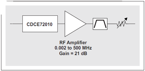 改善轉(zhuǎn)換速率的一種方法是:在 CDCE72010 的 LVCMOS 輸出和帶通濾波器之間添加一個(gè)具有相當(dāng)量增益的低噪聲 RF 放大器,參見(jiàn)圖 14。該放大器應(yīng)該放置于濾波器前面,這樣便可以將其對(duì)時(shí)鐘信號(hào)的噪聲影響程度限定在濾波器帶寬,而非 ADC 的時(shí)鐘輸入帶寬。由于下一個(gè)試驗(yàn)的放大器具有 21 dB 的增益,因此我們?cè)趲V波器后面增加了一個(gè)可變衰減器,旨在匹配濾波后 LVCMOS 信號(hào)到時(shí)鐘生成器濾波后輸出的轉(zhuǎn)換速率。該衰減器可防止 ADC 的時(shí)鐘輸入超出最大額定值。
