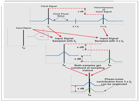 兩個(gè)采樣信號(hào)組合在一起時(shí),我們可以看到,一旦振幅差異超出 ~3 dB 時(shí),由第三諧波引起的總相位噪聲減弱為最小。由于基頻和第三諧波之間的交叉點(diǎn)為 2 × fs,將寬帶相位噪聲積分至 2 × fs 可以得到相當(dāng)準(zhǔn)確的結(jié)果。