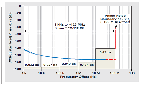 將不同轉(zhuǎn)角頻率的低通濾波器用于 ADS54RF63 的采樣時(shí)鐘(如圖 18 所示),得到了一些如表 7 所列有趣值。該試驗(yàn)結(jié)果表明,LVCMOS 輸出對(duì)時(shí)鐘抖動(dòng)的相位噪聲影響被限制在約 200 到 250 MHz,其相當(dāng)于 122.88-MHz 時(shí)鐘信號(hào)的 80-MHz 到 130-MHz 偏移頻率,并約為 2x 采樣頻率。因此,將寬帶相位噪聲擴(kuò)至 123-MHz 偏移頻率,會(huì)產(chǎn)生 ~445 fs 的時(shí)鐘抖動(dòng),如圖 19 所示。理想情況下,積分下限應(yīng)該位于 500 Hz 處(原因是選擇的 131000點(diǎn)FFT);但是,500-Hz 到 1 kMz 偏移頻率的抖動(dòng)貢獻(xiàn)值極其低,因此為了簡(jiǎn)單起見(jiàn)其在本測(cè)量中被忽略。