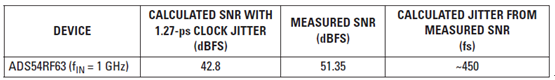 我們知道時(shí)鐘源生成器濾波后輸出的外部時(shí)鐘抖動(dòng)為 ~35 fs,因此我們可以利用測(cè)得的 SNR 結(jié)果,然后對(duì)第 1 部分(請(qǐng)參見(jiàn)參考文獻(xiàn) 1)中的方程式 1、2 和 3 求解孔徑抖動(dòng)值,從而計(jì)算得到 ADC 孔徑抖動(dòng),請(qǐng)參見(jiàn)下面的方程式 4。表 3 列舉了每種 ADC 測(cè)得的 SNR 結(jié)果以及計(jì)算得孔徑抖動(dòng)。