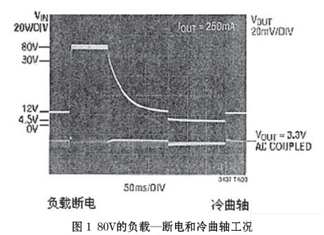 “冷曲軸”(cold crank)段,發(fā)生在汽車發(fā)動機經(jīng)受冷卻或凝固期間,發(fā)動機油變的非常粘滯。因而要求起動機輸出更大的轉矩,相繼需要蓄電池提供更大的電流。這一大的電流負載導致蓄電池/一次母線的電壓降低,甚至低于4V的點火電壓。隨后,又回復至額定電壓13.8V(圖1)。這在某些應用場合,例如發(fā)動電機控制、安全系統(tǒng)和導航系統(tǒng)均不可避免。故要求具有良好調節(jié)的輸出電壓(一般為3.3V)貫穿“冷曲軸”段,以實現(xiàn)全過程的無間斷(連續(xù))運行。