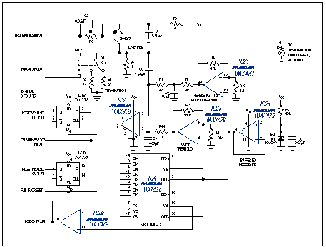 圖8中比較器(IC3)采用單電源供電、地電位檢測以及僅10ns傳輸延遲。DAC (IC4)為雙通道器件,一方面用于脈沖高度測量,另一方面驅(qū)動LCD對比度控制(如圖3)。注意DAC為反向驅(qū)動;電流輸出端連接在一起由經(jīng)過緩沖的電壓基準(zhǔn)驅(qū)動,基準(zhǔn)輸入作為電壓輸出(每路帶有一個外部放大器緩沖)。
